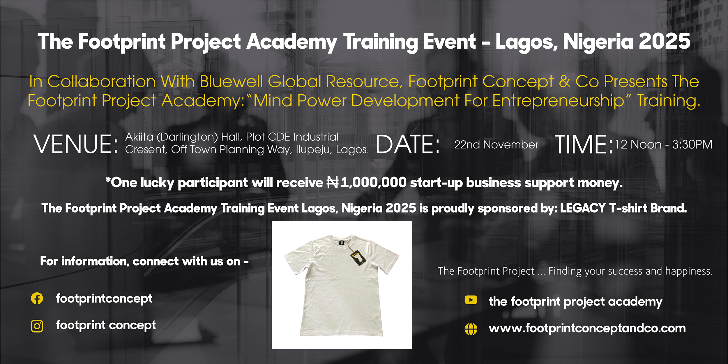 The Footprint Project is a “Mind Power Development For Entrepreneurship” project; developing Minds for Knowledge, Reasoning, Problem solving, Calculated risk – taking, Self – motivation, Confidence to overcome poverty and challenges, and achieve goals. The Footprint Project is an educational platform designed to stimulate your thinking and mental strength abilities. It is a social responsibility project created to encourage young people to develop their Mind power for entrepreneurship. The Footprint Project : “Mind Power Development For Entrepreneurship” training is designed for anyone who wants to develop their Mind power, Build financial security, and Entrepreneurs. The training offers people the knowledge ability of how to develop their entrepreneurial mindset, organize a small business, raise capital, manage risk, and achieve their goal.